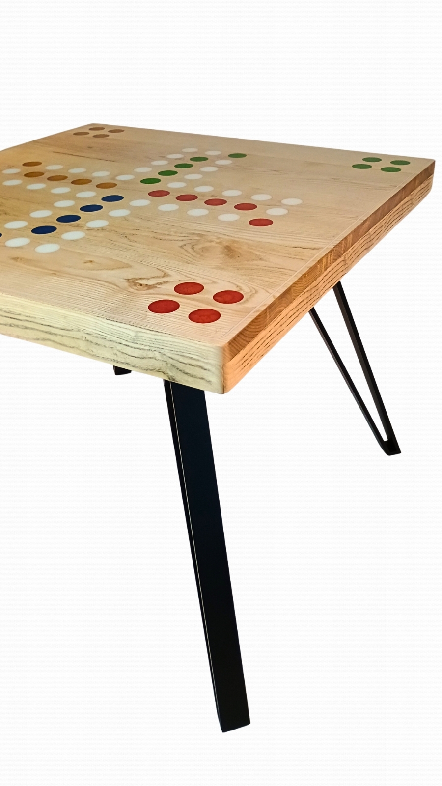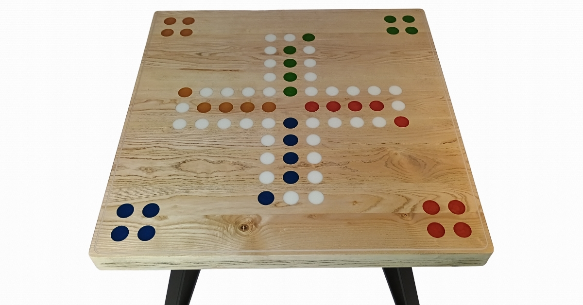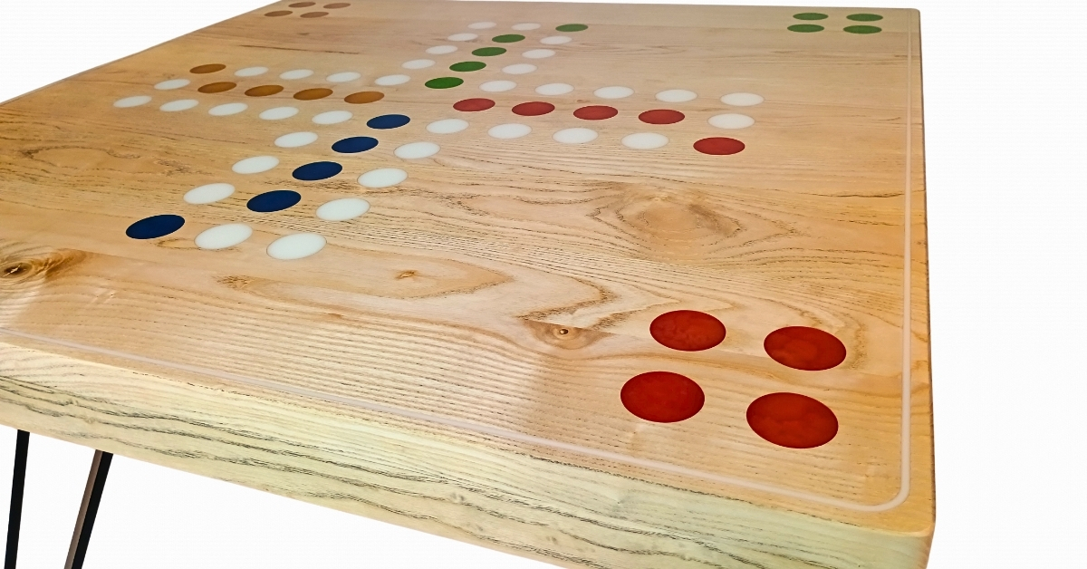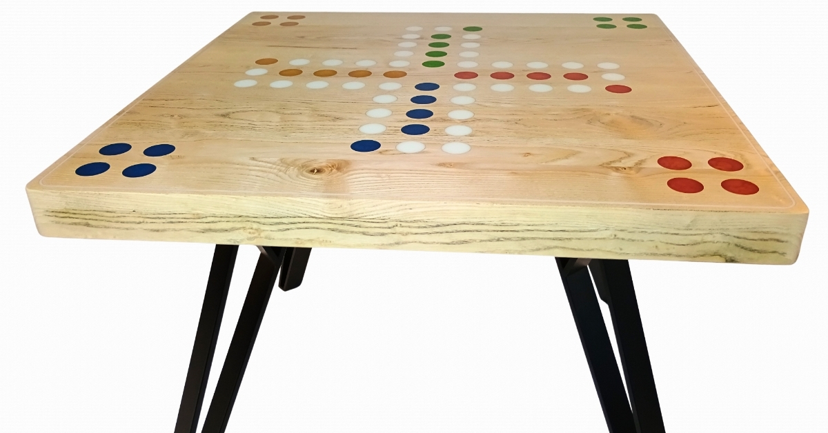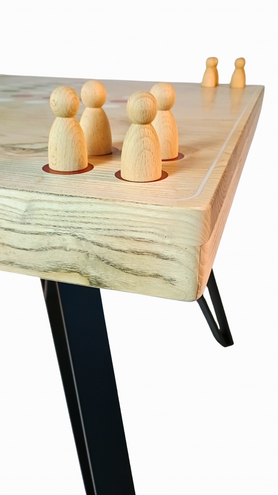 Hravý jídelní stůl z masivu jasanu s hracím polem člověče nezlob se. Víceúčelový stůl pro každodenní použití i zábavu.