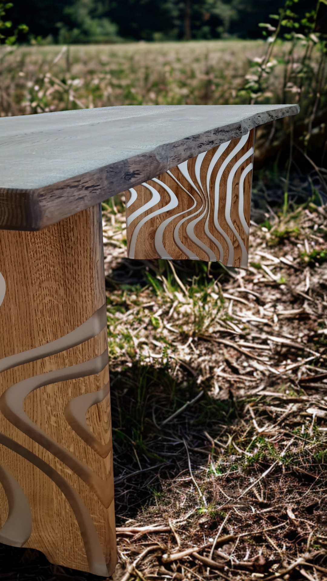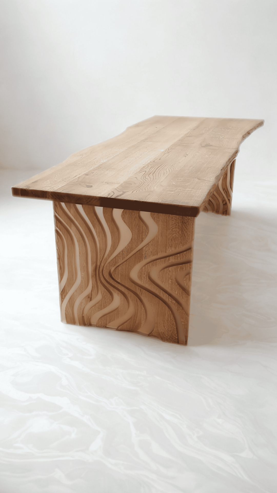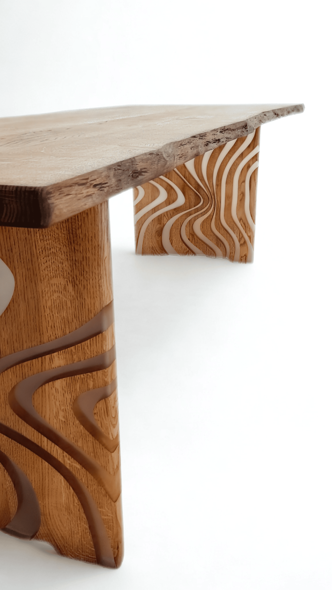 Designový originál. Jídelní stůl z masivu dubu s průsvitnou epoxidovou pryskyřicí. Tento stůl Váš interiér osvěží, zaujme na první pohled. Solitérní stůl který nechá vyniknout Váš vkus.