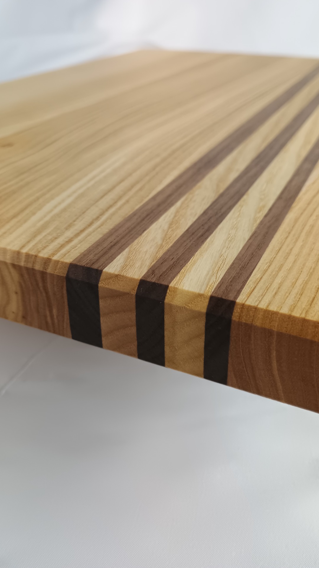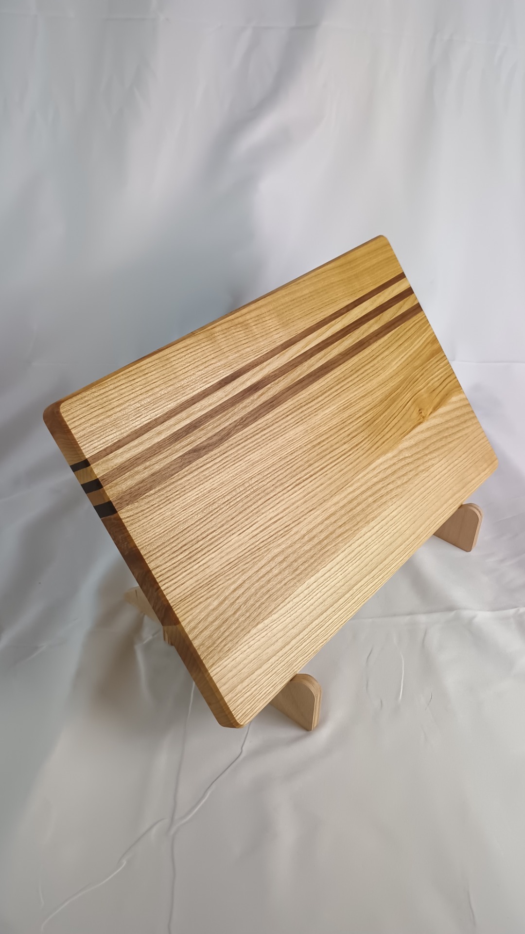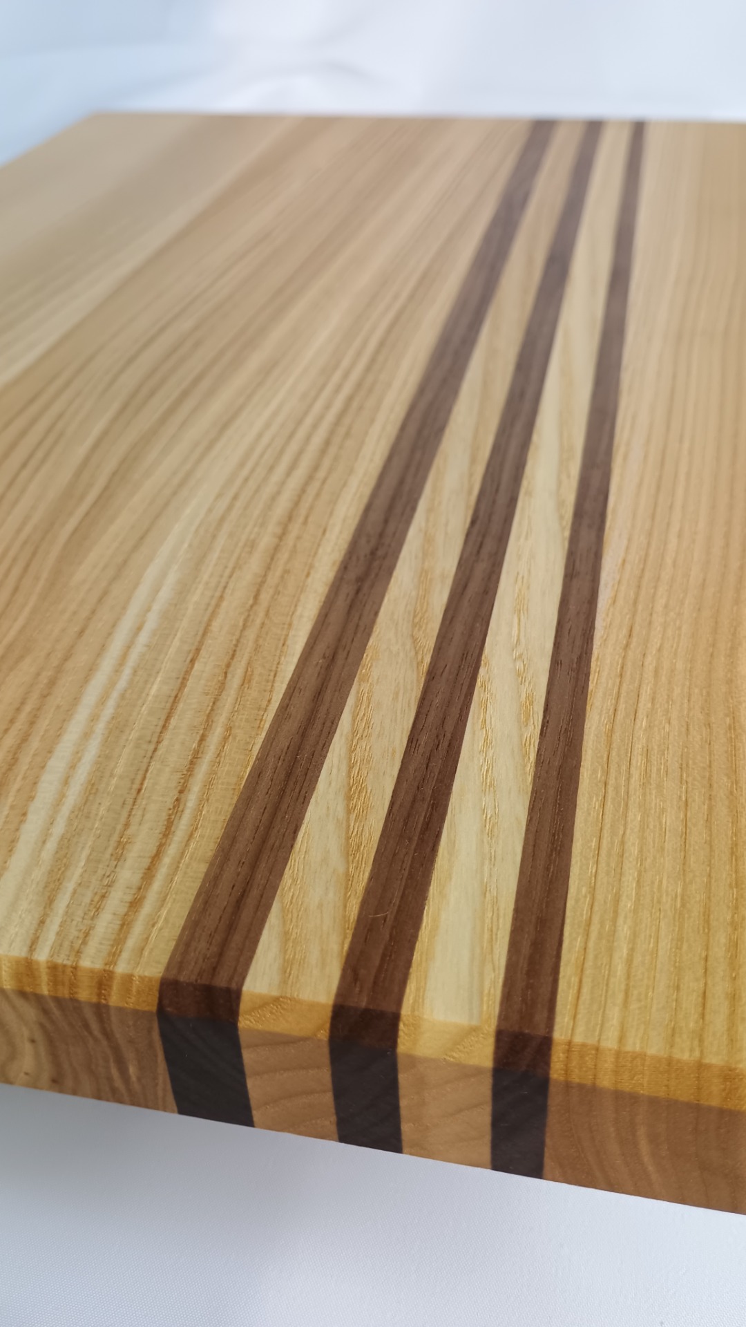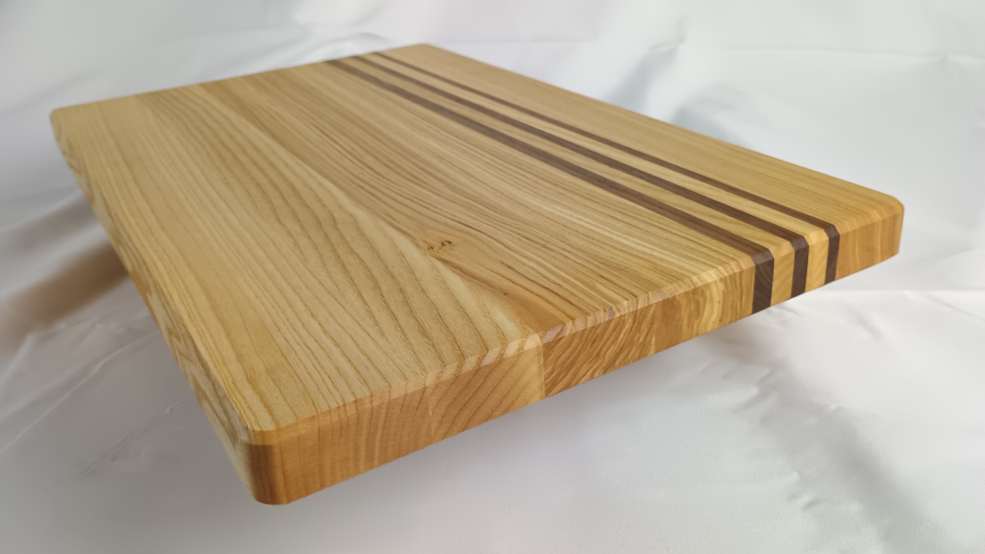 Designové krájecí prkénko z masivního jasanu v kombinaci s americkým ořechem spojuje funkčnost, řemeslnou kvalitu a estetickou hodnotu. Světlá kresba jasanu je doplněna výraznými liniemi tmavého ořechu, které vytvářejí elegantní a moderní kontrast.