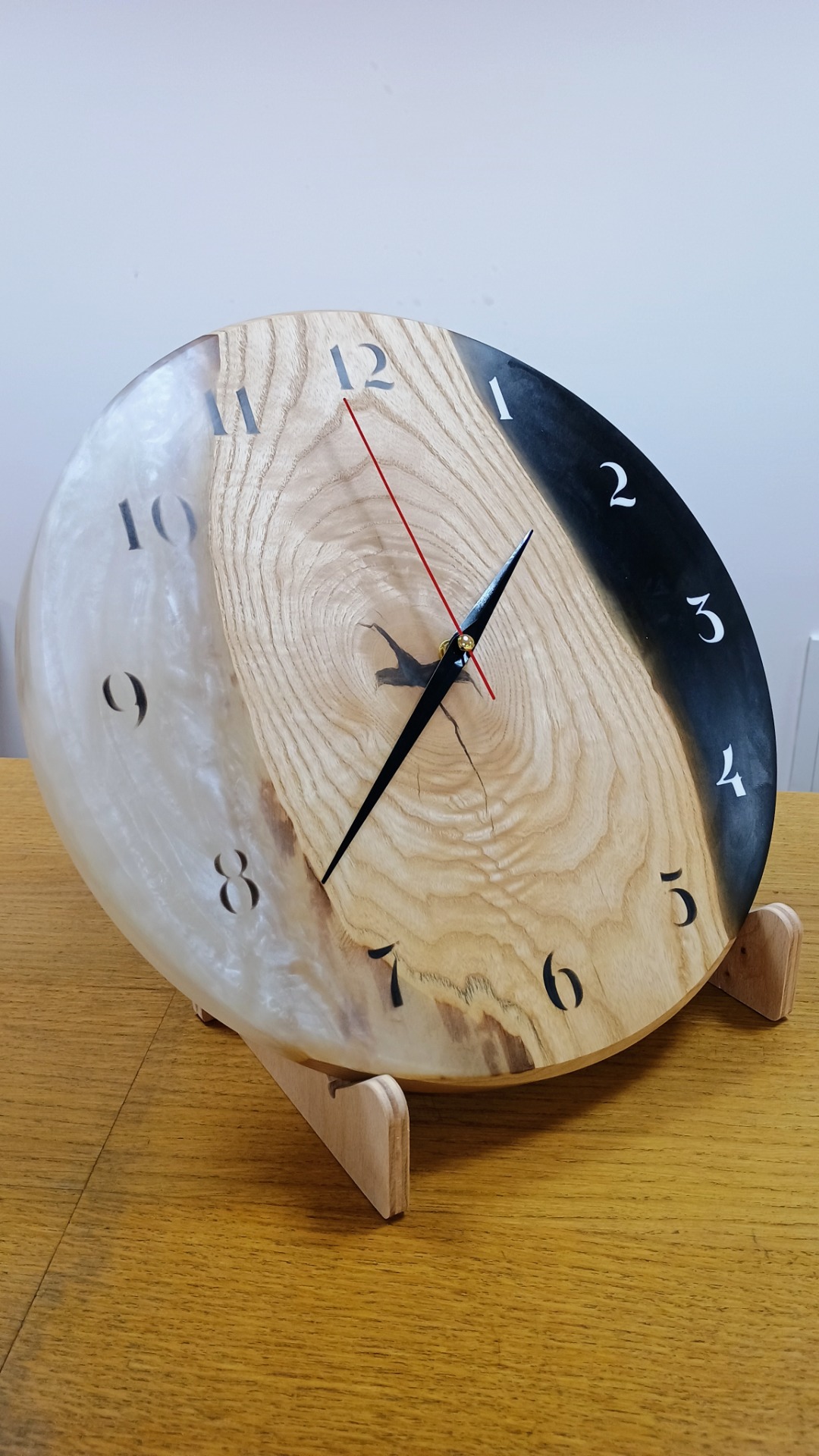 Tyto hodiny jsou vyrobeny v kombinaci dřeva jasanu a epoxidové pryskyřice. Tato kombinace dodává hodinám originalitu, proto zaujmou každého příchozího.