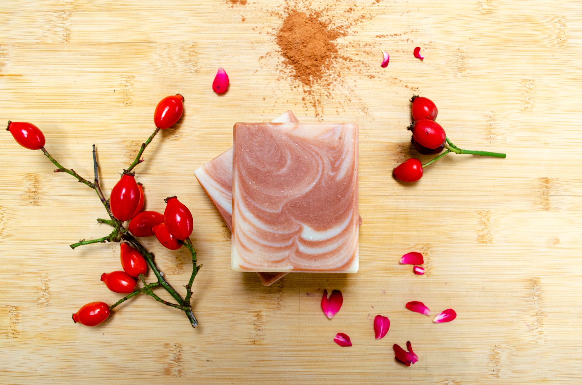 Toto mýdlo dokonale pečuje o Vaši pleť. Bambucké máslo a mandlový olej jsou suroviny, které mají úžasné hydratační a vyživující účinky. Šípkový olej je v péči o pleť úplným pokladem - má protizánětlivé účinky, je plný antioxidantů a vitamínů a podporuje hojení. Pro ještě příjemnější pocit při použití mýdla jsem přidala ovesné hedvábí, které v mýdle slouží jako velmi jemný peeling a zároveň pleť rozjasňuje. Mýdlo je barveno červeným jílem, který dokáže pleť hloubkově vyčistit a zároveň jí navrací její přirozenou barvu.